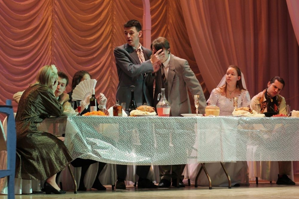 В спектакле представлены Чеховские аллюзии на традиции русской свадьбы в сатирических и острых тонах. Высмеивание опошления традиций и обрядов. Пошлость, развязность и отсутствие субординации, неспособность соблюдения принятым между людьми ритуалом торжественного или лирического обращения, в праздничную обрядовую ситуацию врывается обыденщина, вульгарность и непристойность.